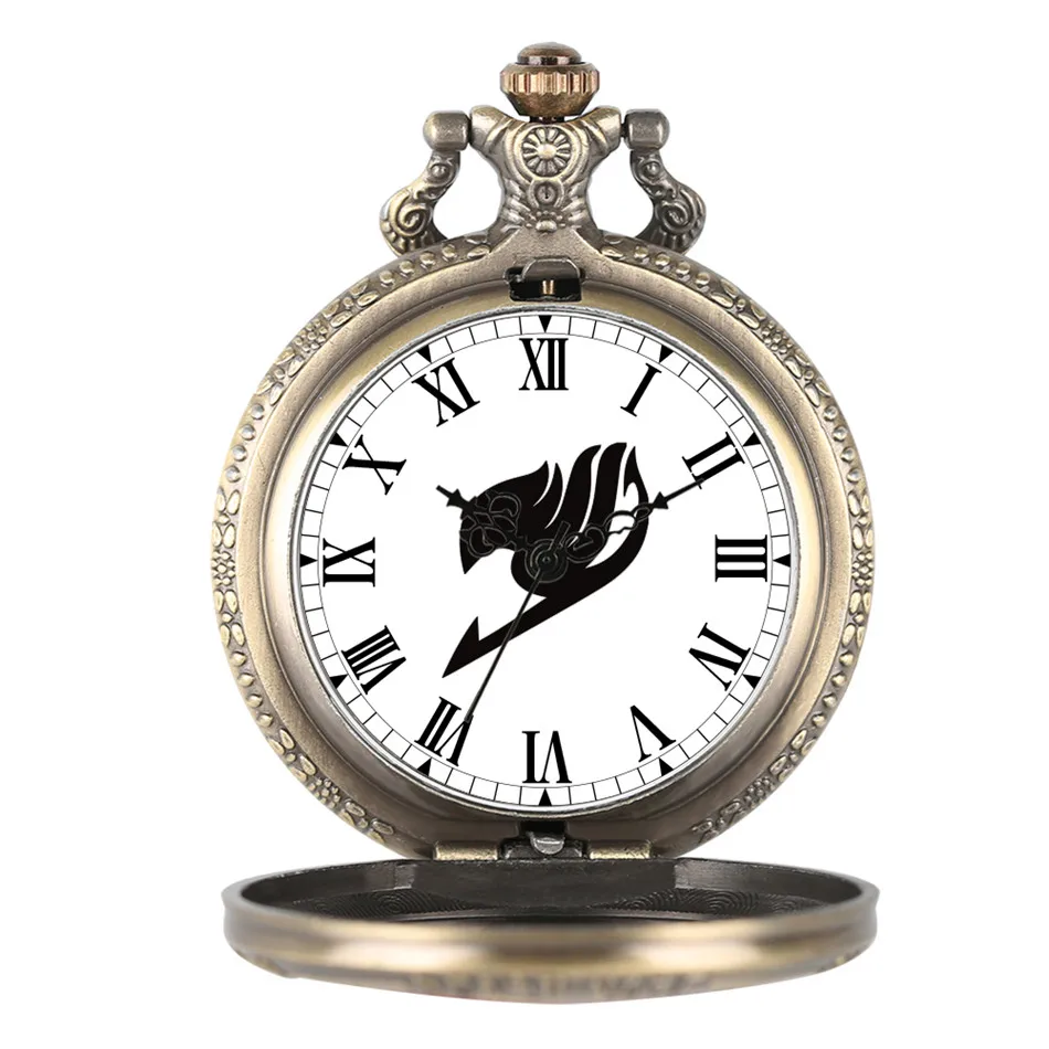 Name: Reloj de bolsillo de cuarzo con temática de cola de Hada de Anime japonés, Charm con números romanos, esfera redonda, collar de bronce, cadena colgante, regalos